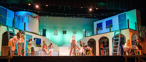 The set design is the first element that caught my eye, with a keen attention to detail that can only truly be summed up in a word: Greek. White and blue colors dominate the set, mixed with the charm of flower-woven trellises, a tiled fountain, and ladders leading to the balconies some of the key song and dance numbers are performed.
